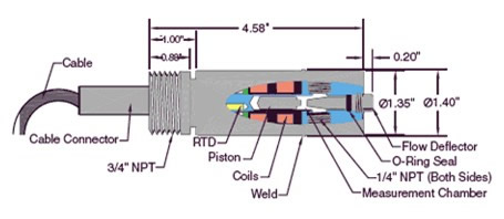 位于活塞上方的導(dǎo)流裝置,將液體導(dǎo)入測(cè)量室,活塞持續(xù)運(yùn)動(dòng)以不斷更新樣品,同時(shí)機(jī)械摩擦不斷擦洗測(cè)量室。 一個(gè)內(nèi)置的RTD溫度測(cè)量探頭,實(shí)時(shí)測(cè)量測(cè)量室的溫度。