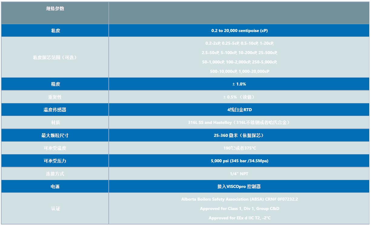 能夠在0.2-20000CP或等量CST的粘度范圍內(nèi),進(jìn)行13種不同粘度范圍的測(cè)量。 探頭頭部的最大流速為10英尺/秒(3米/秒)。